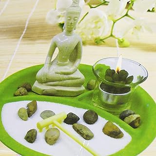 Kamaca Zen Garden Set de décoration sur plateau avec statue Bouddha assis avec bougie chauffe-plat décorative et LED, Schale Rund Grün mit Buddha Creme, 20 cm x 20 cm x 13 cm